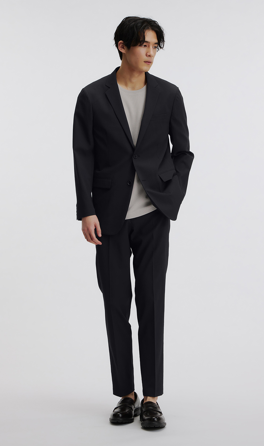 共生地のスラックスと合わせることで、スーツスタイルの着こなしもお楽しみいただけます。