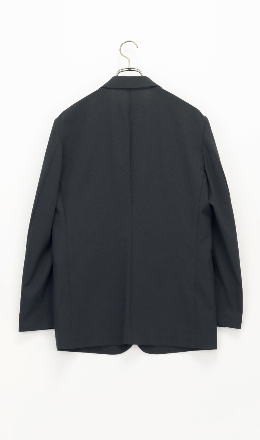 表面感が特徴の素材でTEXBRID®フルダル糸を用いてポリエステル糸特有のキラつきを抑え、シワ加工を施しています。より軽くするために内蔵物を省き、背裏・袖裏も省いた軽量仕様ながらも、ドレス仕立てにこだわった2ボタンジャケットです。