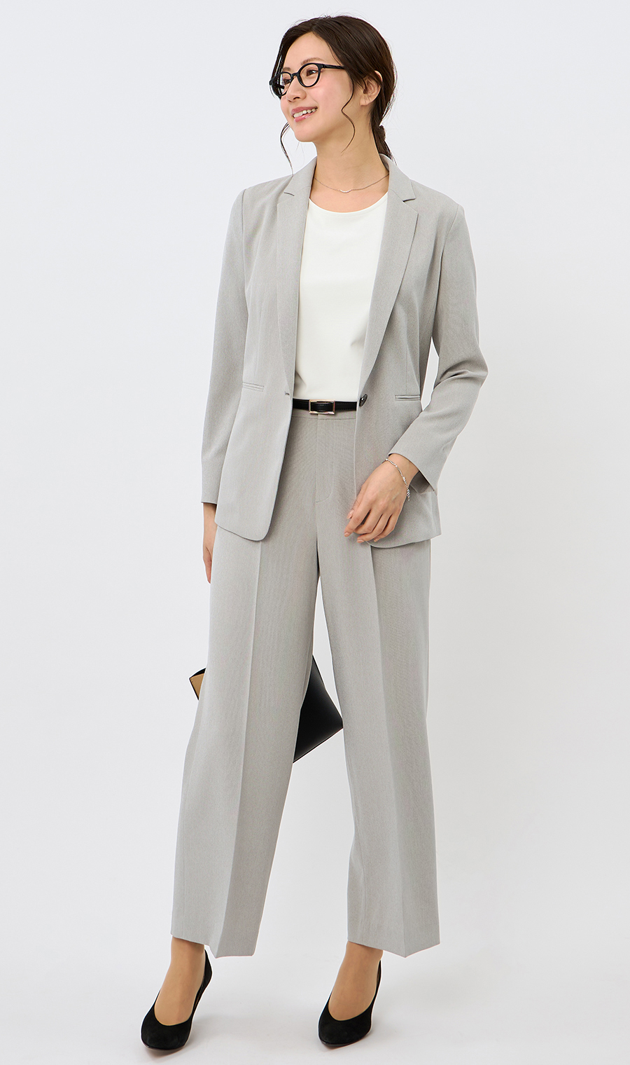 単体でも着用可能な共生地ジャケットと組み合わせ、スーツとして着用可能。
