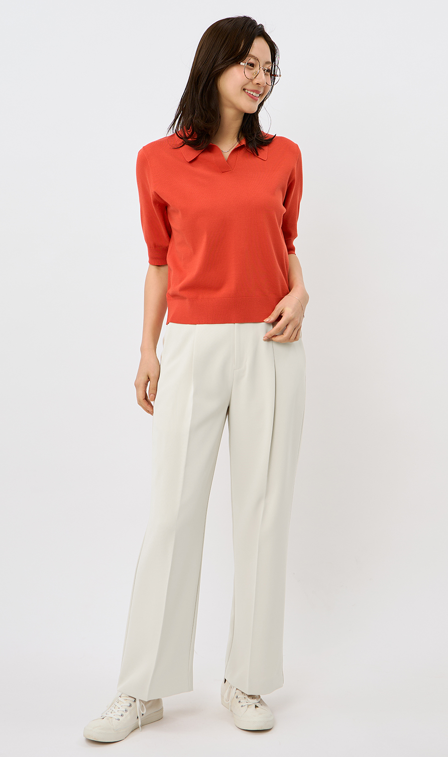 トレンド感の高いスキッパーカラーのニットポロです。夏の期間が長くなってきた近年の気候でも着用しやすいように、さらっと着用しやすい接触冷感素材を採用しました。襟元はシャープな印象になるように開き具合を調整しているので、オフィスカジュアルにも安心。パンツと合わせて一枚着でのご着用がおすすめです。