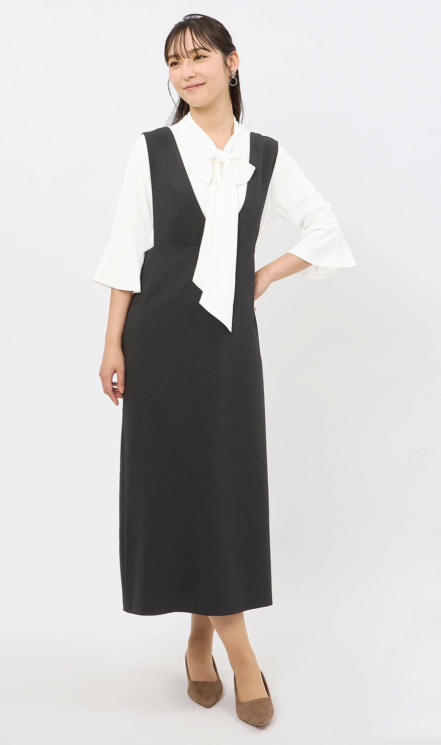 きれいなシルエットで着用いただけるトレンド感のあるジャンパースカートと、程良い華やかさのあるボウタイブラウスの2点セットです。