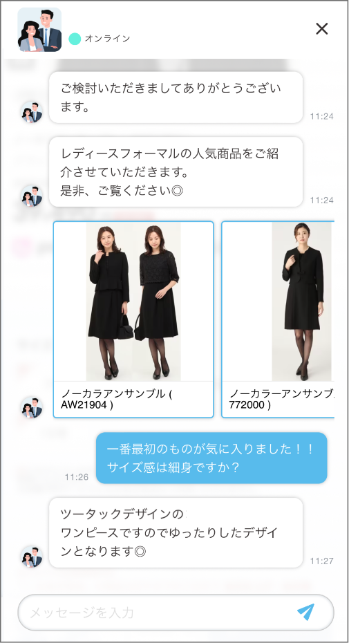 - ・本サービスはあくまでもオンラインストアの商品に関することですので、店舗のリアルタイム在庫はお答え出来かねます。