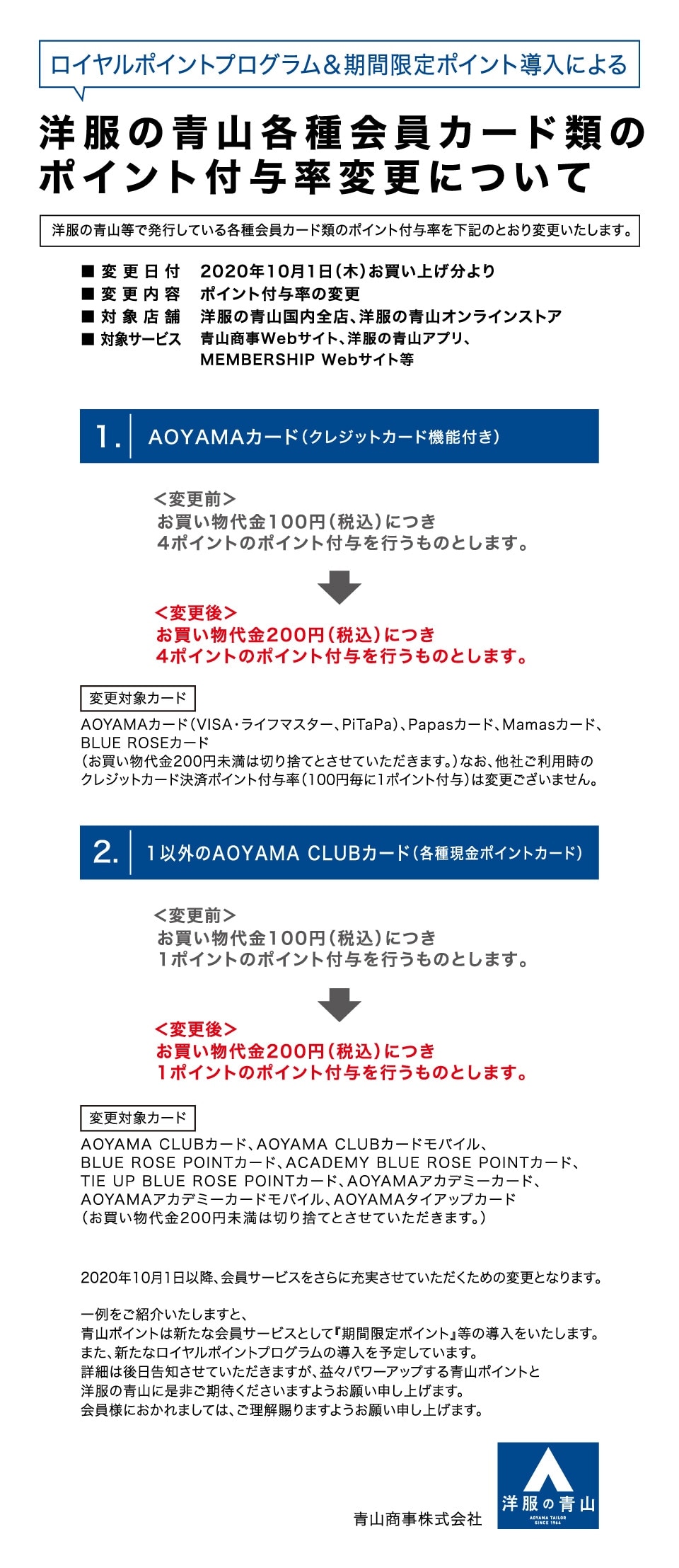 - ・ポイントの利用は、全国の「洋服の青山」でのお買い物に、1ポイント=1円としてお使いいただけます。