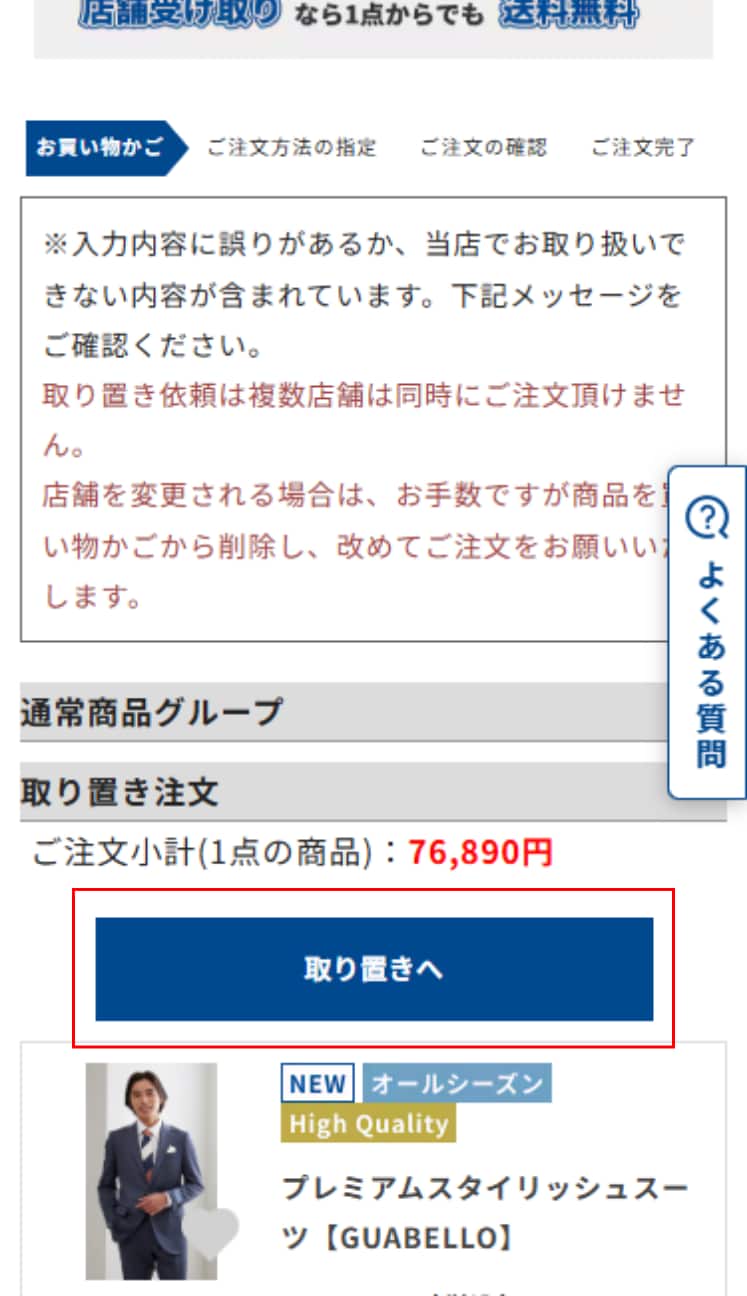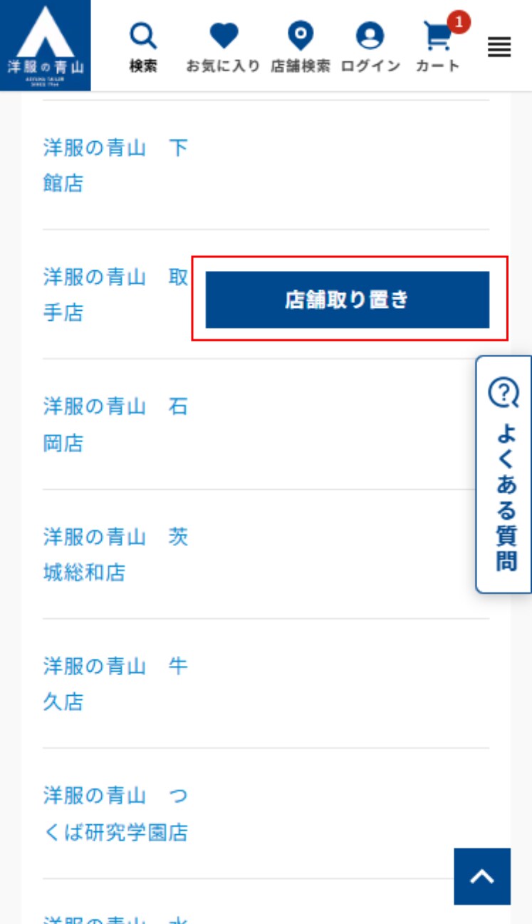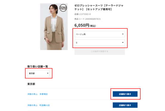 洋服の青山オンラインストアでみつけた気になる商品をご指定の店舗にてお取り置きができるサービスです。