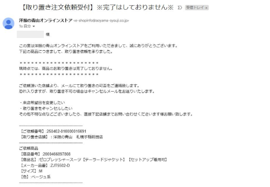 確認のため、取り置き注文依頼受付メールをお送りします。