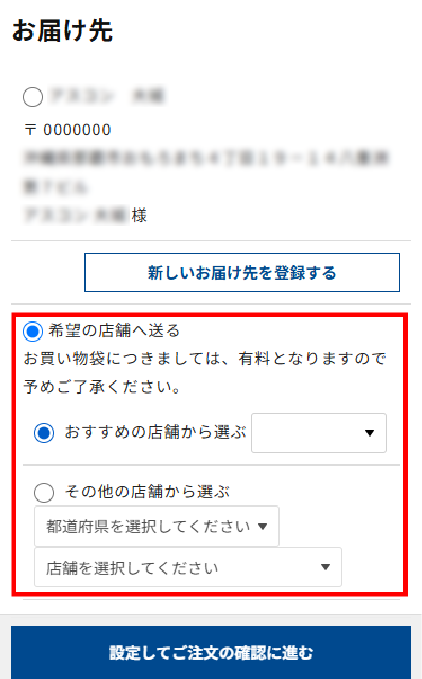 注文画面のお届け先の指定で「希望の店舗へ送る」を選択。