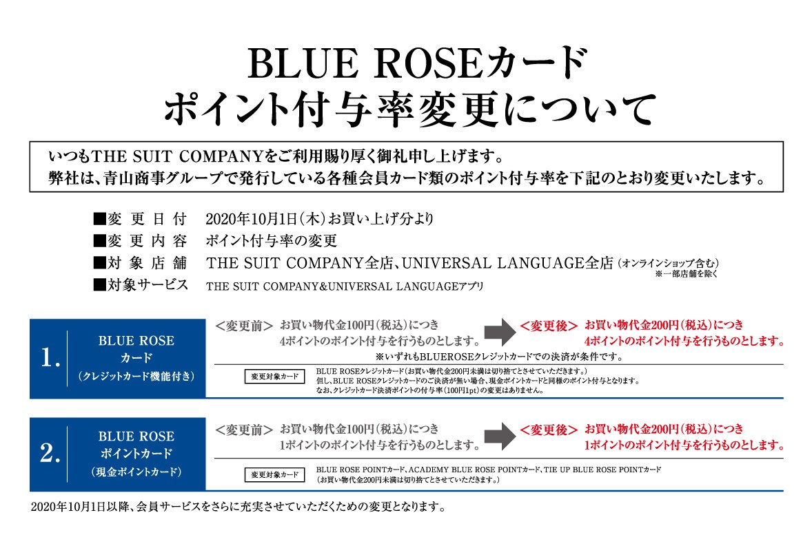 ROSEポイントは「洋服の青山」、「SUIT SQUARE」、「UNIVERSAL LANGUAGE」、「UNIVERSAL LANGUAGE MEASURE'S」で共通でご利用いただけます。各店舗でのお買い物で、ROSEポイントが「たまる、つかえる!」