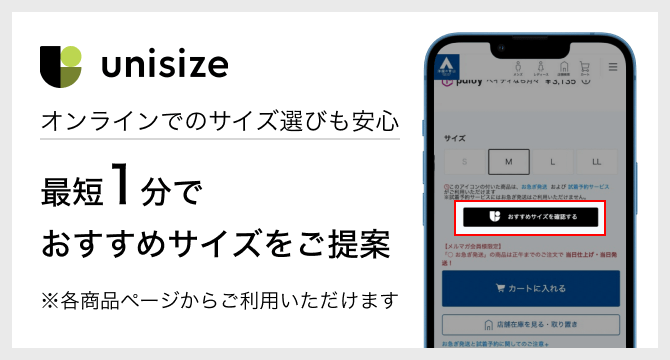 ABy using "unisize" on the product details page, we will recommend the perfect size for you. Just answer a simple questionnaire and we will suggest the best size for you.