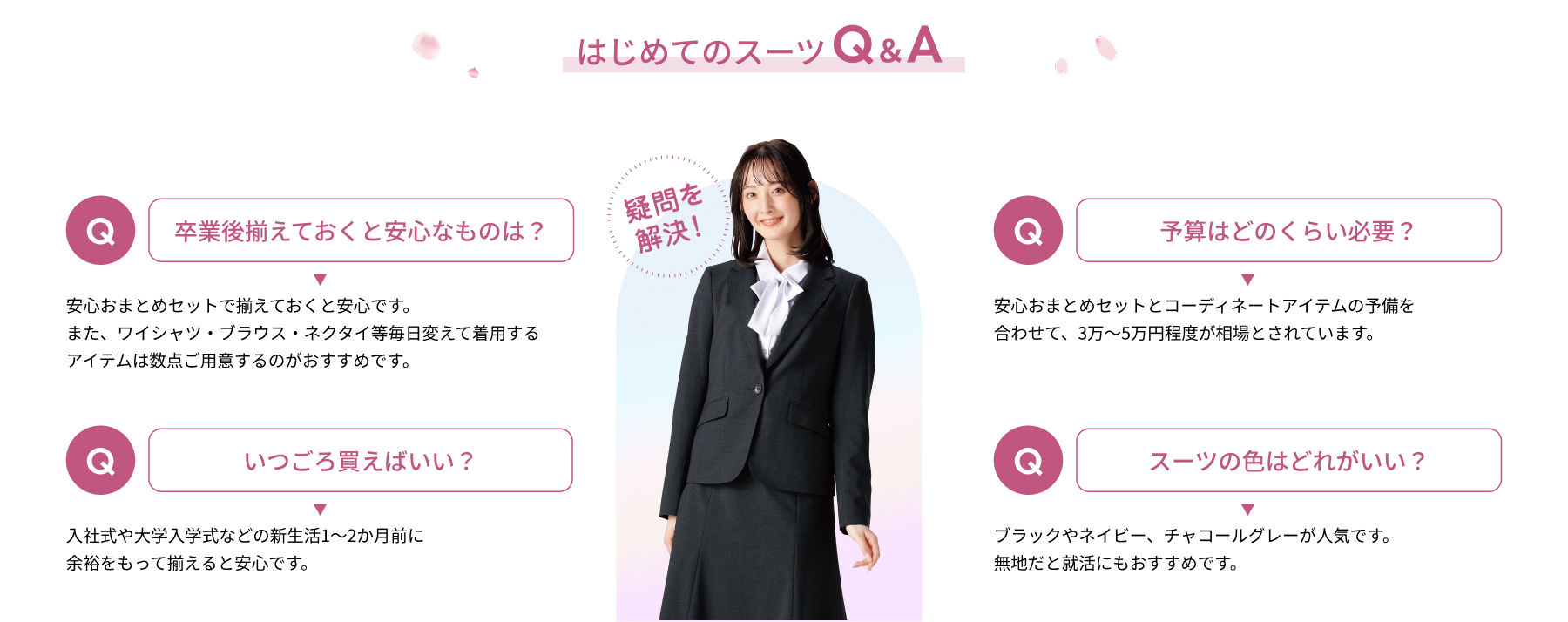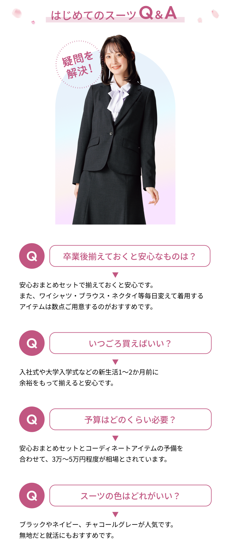 This suit, consisting of a black two-button jacket and a fitted skirt, is made of high-quality material that can be worn for many years, and features a classic silhouette. By changing the blouse, it can be worn for everything from entrance ceremonies to internships and job hunting. Its overwhelming versatility makes it a must-have item. For entrance ceremonies, pair it with a thin ribbon blouse to add a gentle touch.