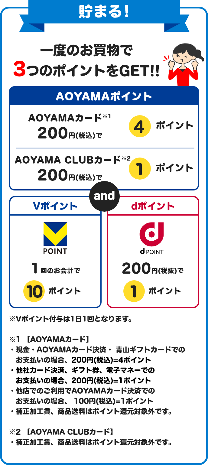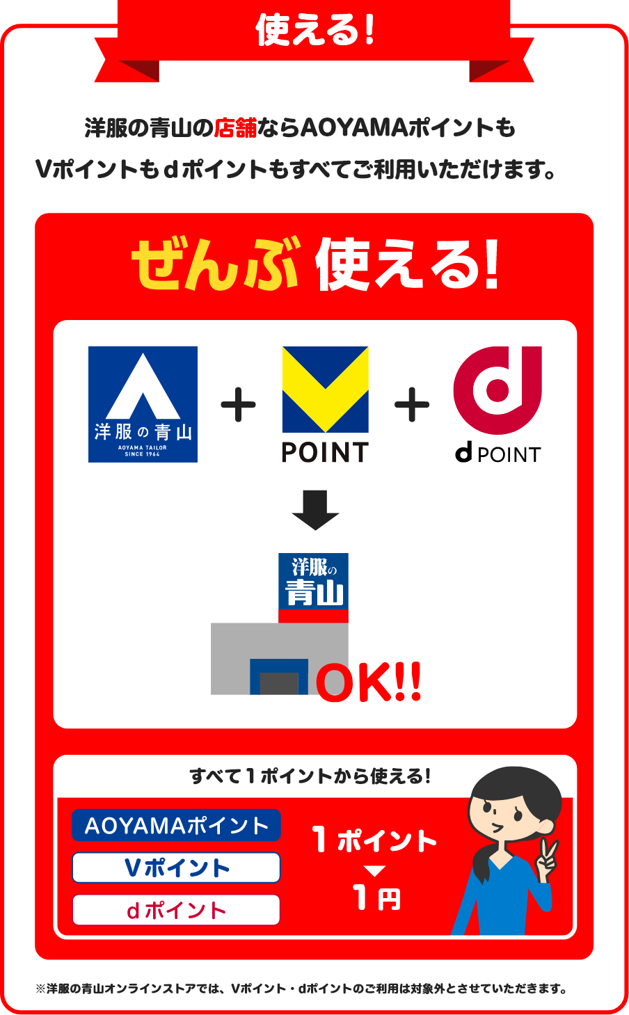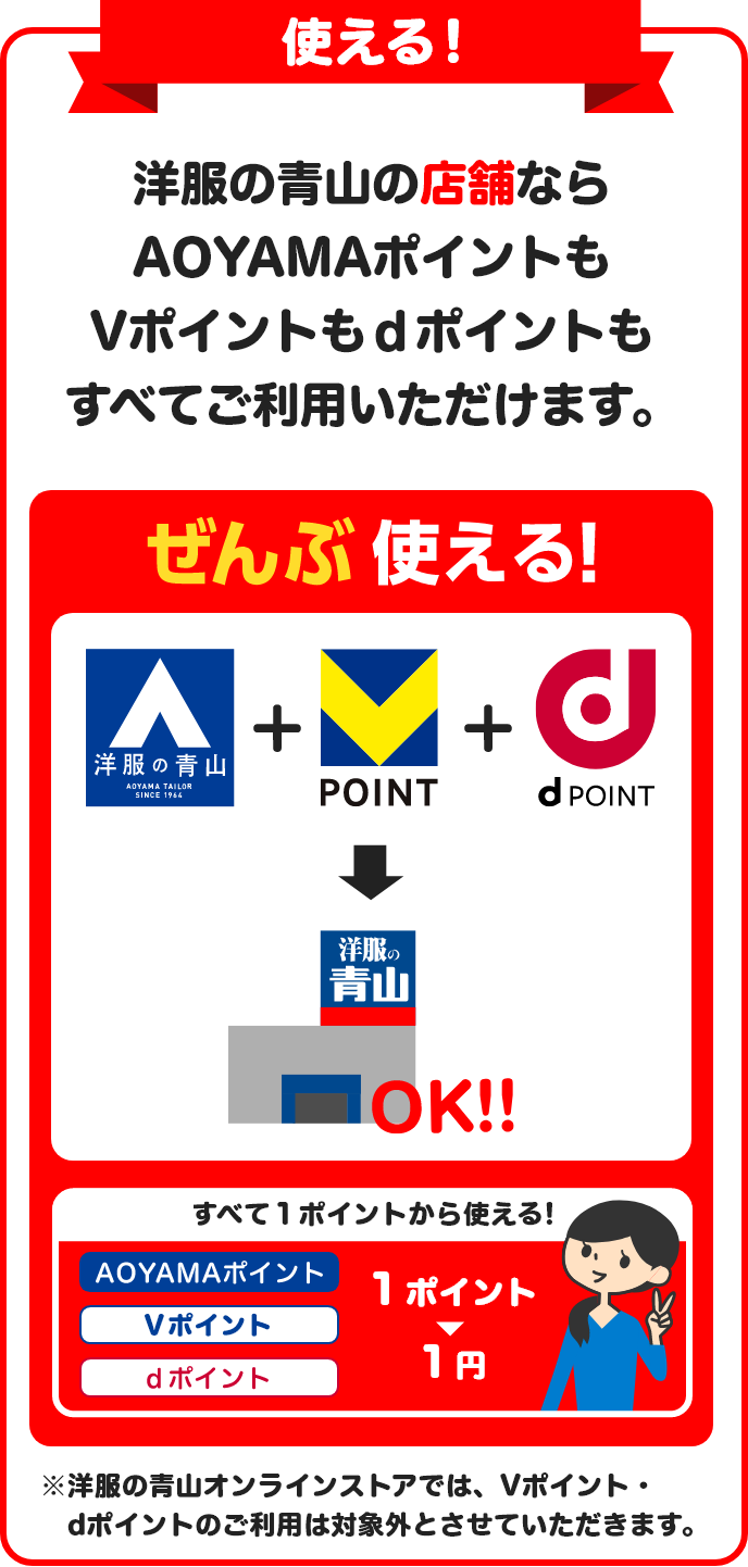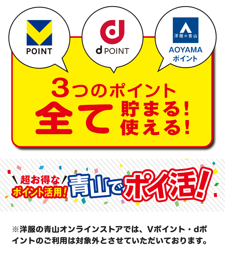 使える! 洋服の青山の店舗ならAOYAMAポイントもVポイントもdポイントもすべてご利用いただけます。 使える! 洋服の青山の店舗ならAOYAMAポイントもVポイントもdポイントもすべてご利用いただけます。