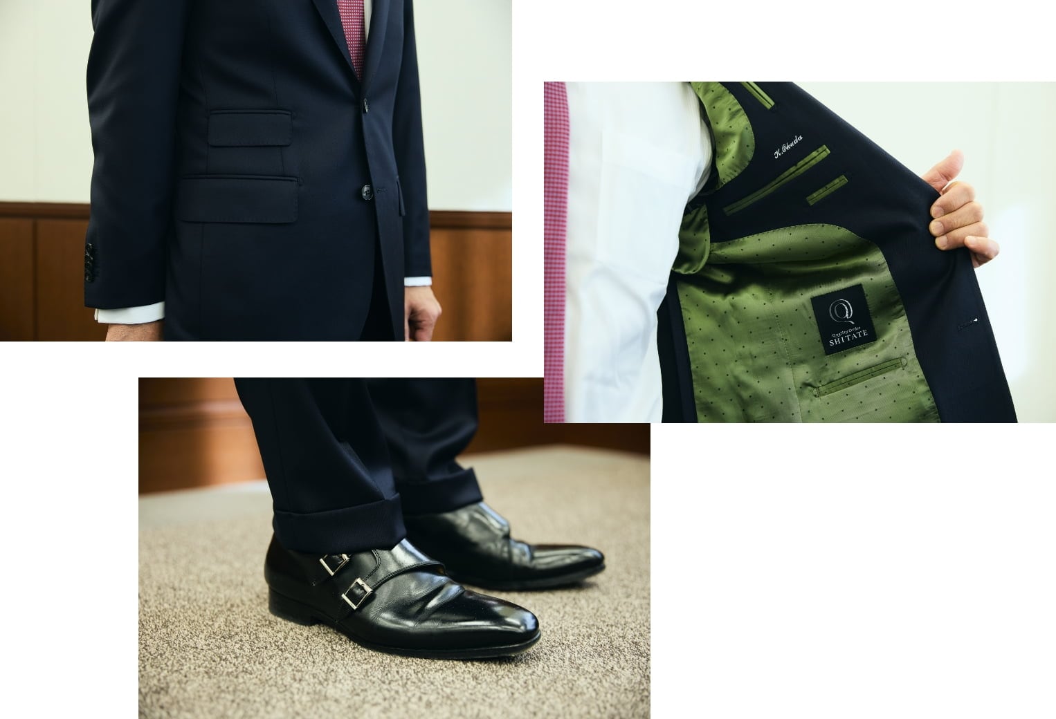 「SHITATE」の担当の方に採寸をしていただいた際、生地や裏地などを選ぶときにチェンジポケットをおすすめしていただき、選んでみました。これまではあまり選んだことのないもので、私にとって挑戦でしたが、実際、こうして羽織ってみて、鏡越しに眺めてみるといいアクセントになり、気に入りました。ジャケットの裏地はエメラルドグリーンに決めました。後で気が付いたのですが、裏地は明るくてキレイなものを選ぶことが多いかもしれませんね。こういう風に裏地を選べるのもオーダースーツの楽しみなところです。