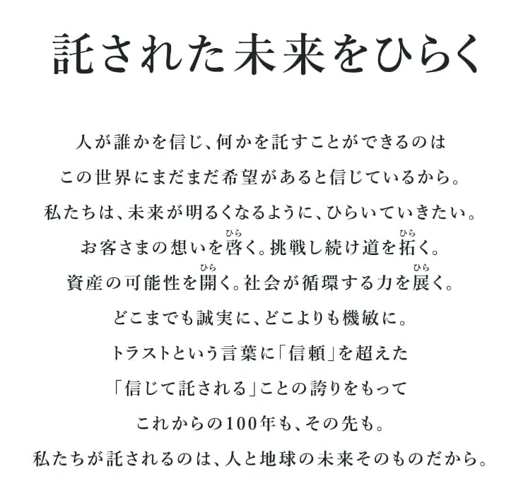 創業100年にあたり、「託された未来をひらく」というブランドスローガンを策定しました。お客さまや社会から信じて託される尊さと未来への願いに応えるという強い意志を表しています。スローガンは「私たちが託されるのは、人と地球の未来そのものだから」という文章で締めくくっています。将来世代からも託された未来です。当グループは「グリーンな社会の実現」や「人生100年時代のFINANCIAL WELL-BEING」など現代社会が抱える社会課題解決、そして次の100年新たに直面する社会課題の解決に、信託の力で挑戦してまいります。