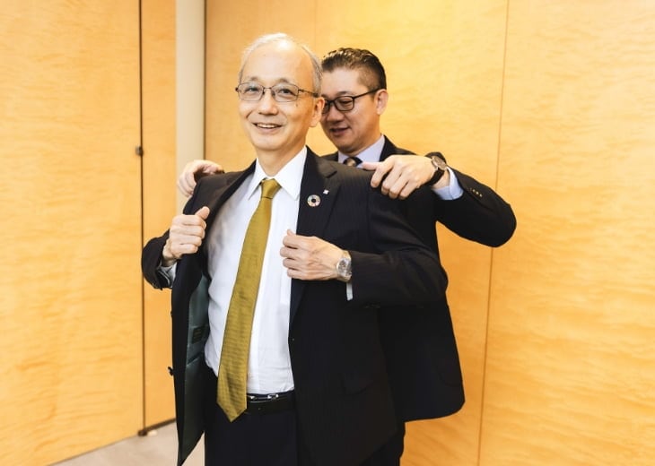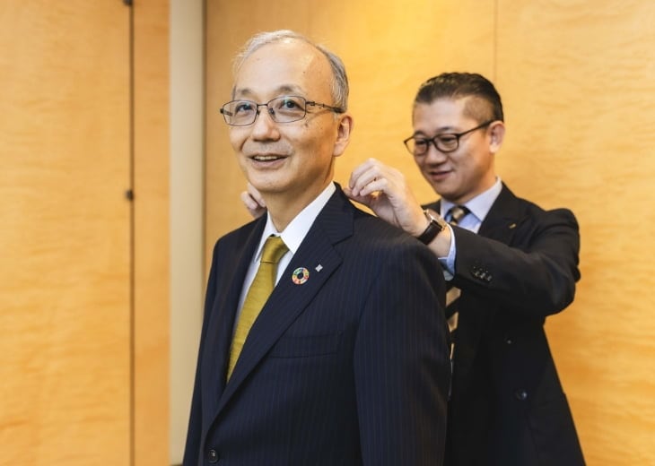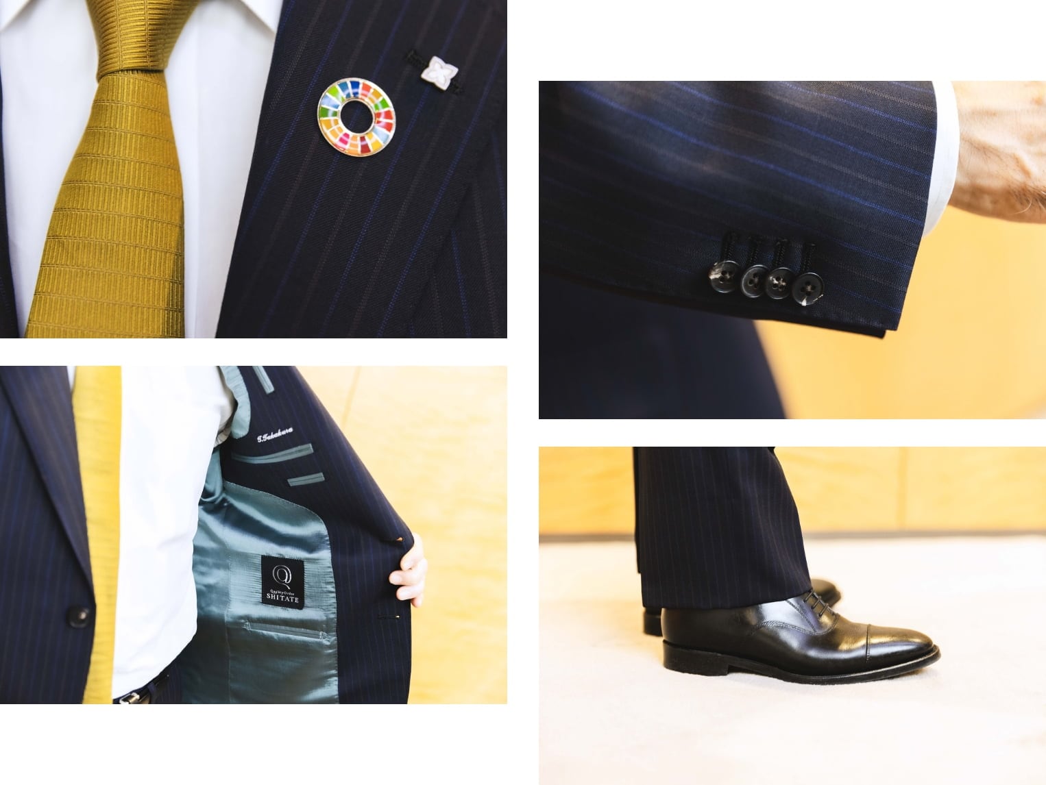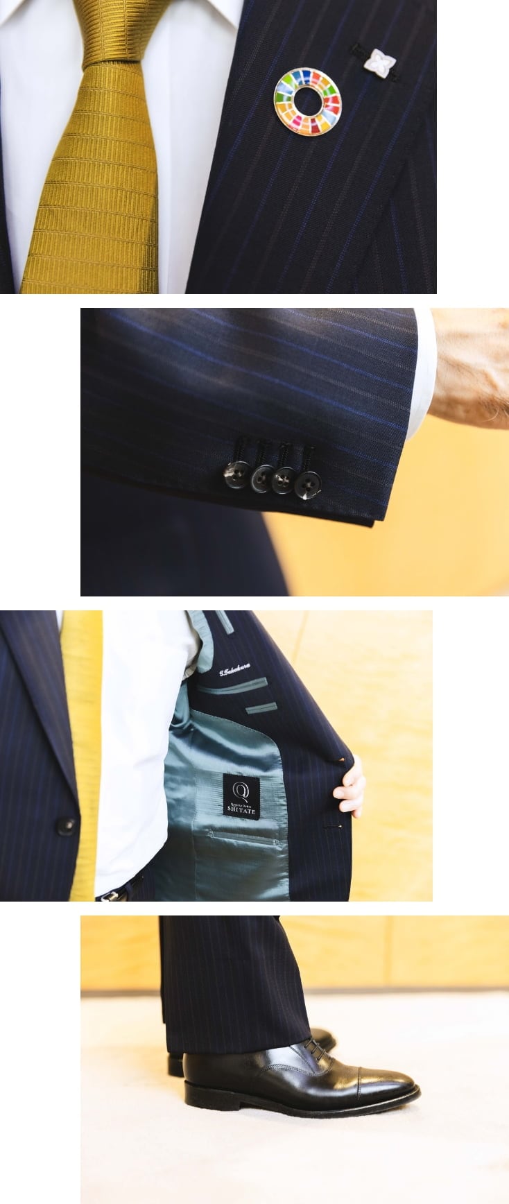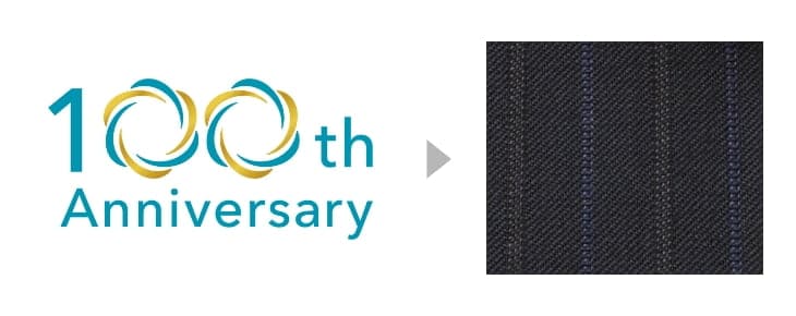 特にこだわったのはスーツの生地です。当グループの創業100周年ロゴの配色に近いブルーとゴールドのストライプが入ったものを選びました。また、裏地をコーポレートカラーである「フューチャーブルー」をイメージした生地にしたのも、隠れたお洒落として気に入っています。生地の色調は100周年ロゴをイメージしたゴールドのネクタイに合うものにしています。今後のイベントで、当グループの創業100年のイメージにぴったりと調和する、こちらのスーツを着用できることを楽しみにしています。