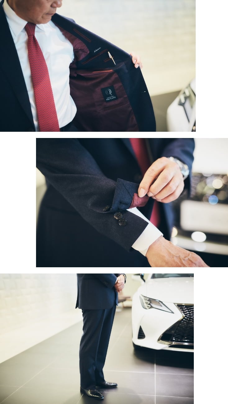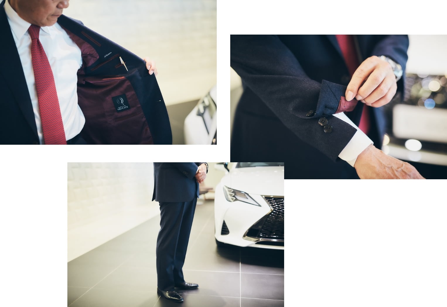 毎日の仕事では、スーツにネクタイ姿。自分にとっての戦闘服なので、オフのときにはスーツは着ません。ただオフ以外のときにいつも着るものなので、スーツの数自体はかなり多いほうでしょうか。シャツもネクタイもそろえて、ローテーションで回していく。クルマの営業をしていると、スーツを着ていてもひざをついたり、しゃがんだり…。ですから一般的な仕事をされている方と比べると、スーツが傷むのは早いでしょうね。このようにスーツは自分にとって作業着でもあるのですが、とにかく清潔感を保ちながらも良質なスーツを惜しげなく着るのがモットーです。新車のお披露目のセレモニーがあるときにはチャネルカラーがボルドーなので、赤系のネクタイをして出掛けるなど、企業の代表としてスーツやアイテムを選ぶよう、意識しています。