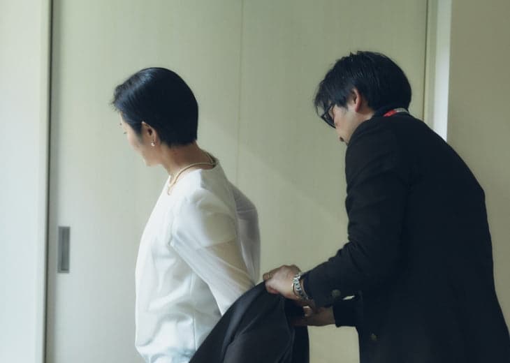 普段の洋服を含めて、スッキリしたデザインのものが好きなのでジャケットは、ノーカラーのものに。それに合わせてジャケットのポケットもふたのないものにしました。シャツを華やかなものにしたり、ハイネックを選んだり…。インナーを変えれば、まったく異なる印象になる。会談した方たちとの記念撮影をする機会も多いので、同じスーツでもいろいろなコーディネートができそうです。