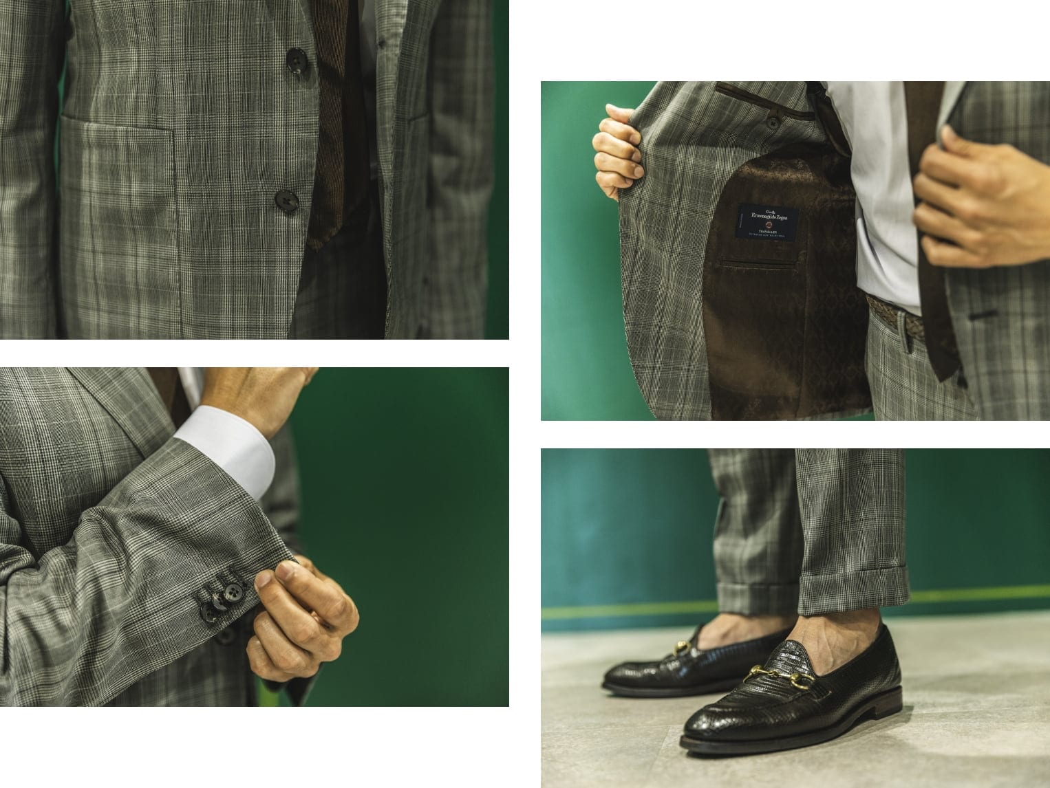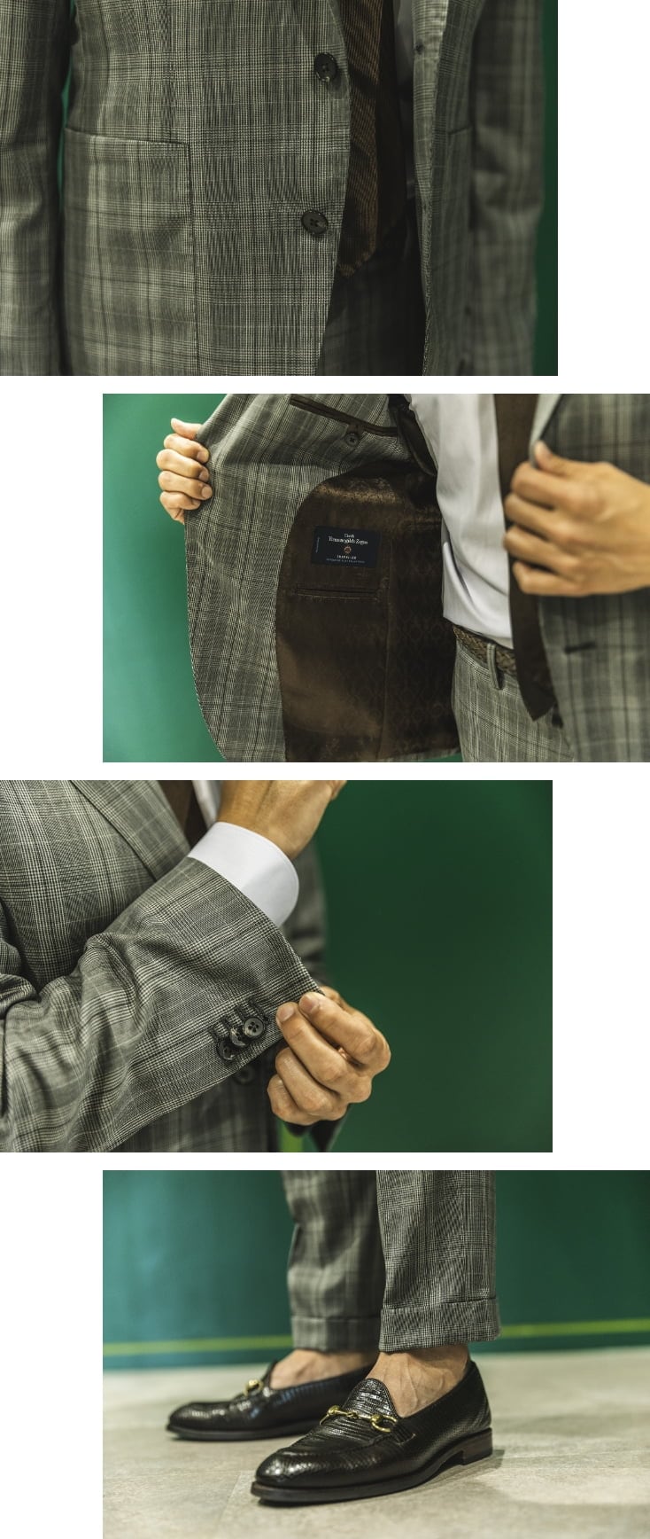 ゼニアの生地は素材の質感や風合いが素晴らしく、グレンチェックの柄使いが洗練されていたので、この生地を選びました。ブラウンの裏地に合わせて同色ネクタイをチョイス、シャツとチーフをブルー系でまとめてみました。全体のバランスが非常に良く、ジャケットにジーンズを合わせるなど、さまざまなコーディネートを楽しめそうです。高級感と機能性もあるので、これからさまざまなシーンで活躍してくれると思います。