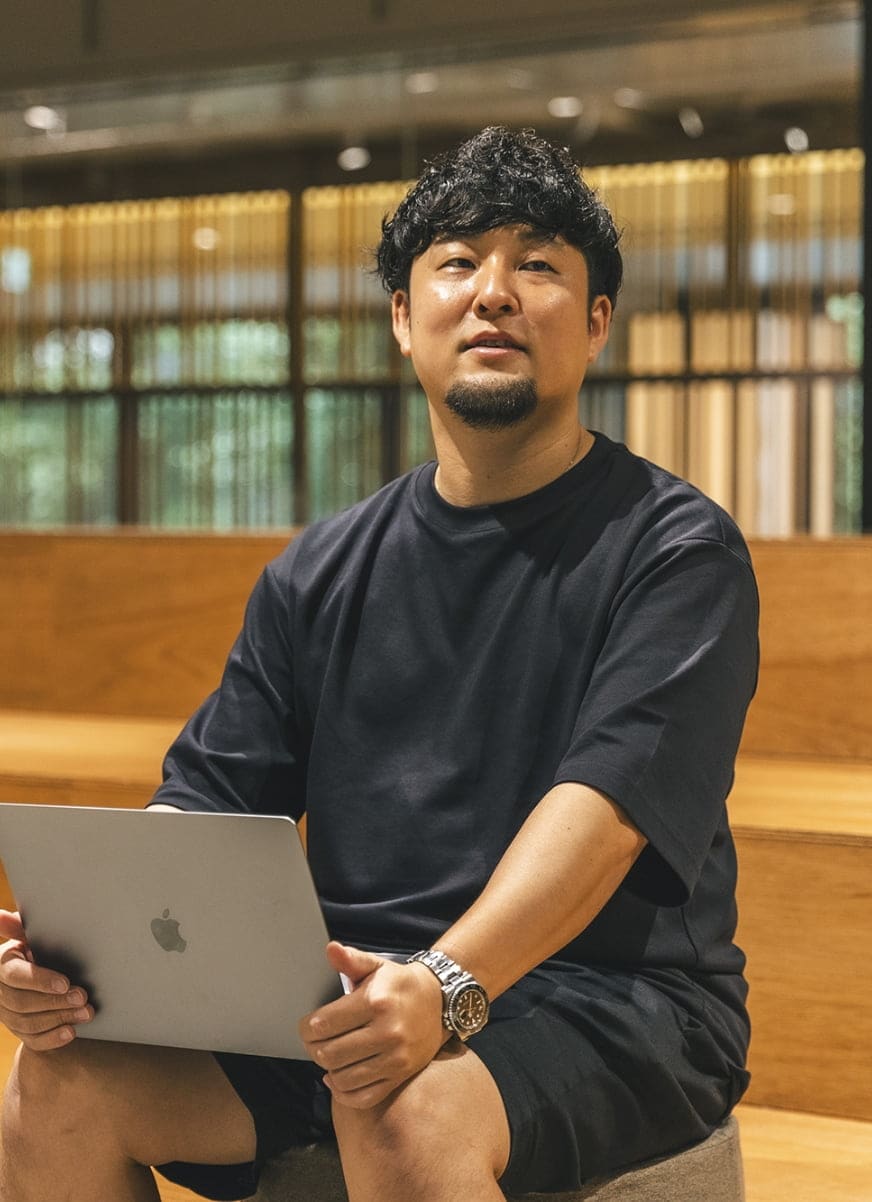 最近では取材や登壇の機会も増え、対外的な業務で表舞台に立たないといけないときにもスーツを選ぶようにしています。ただ、シャツを着ることはなく、セットアップに黒Tシャツが定番。フォーマルかつカジュアルに、さまざまな企業の方に合わせるべく、両方の空気感が取り入れられると考えてのことです。1年中、このスタイルを貫いていますね。