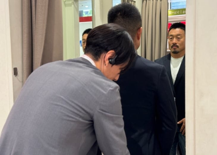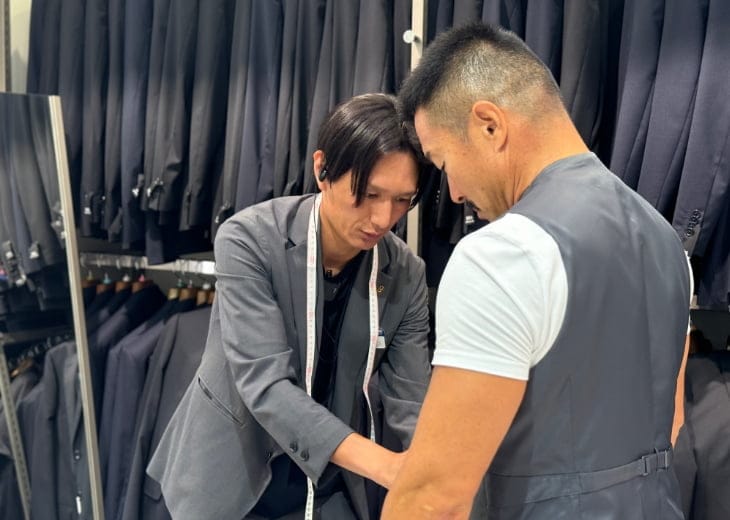 以前から看板を見かけていたこともあり、全国どこででもあるというイメージがあったのですが、式場近くにあり、駆け込みました。この取材の依頼をいただくまで、正直、オーダーができるというのは知りませんでした。2019年に一部の店舗から始まり、2024年には全国でオーダーができることになったというのはいいですね。これからも「洋服の青山」でスーツを買うのが楽しみです。