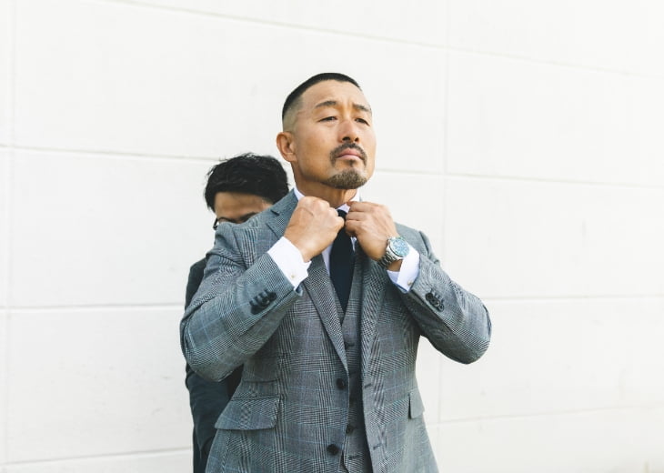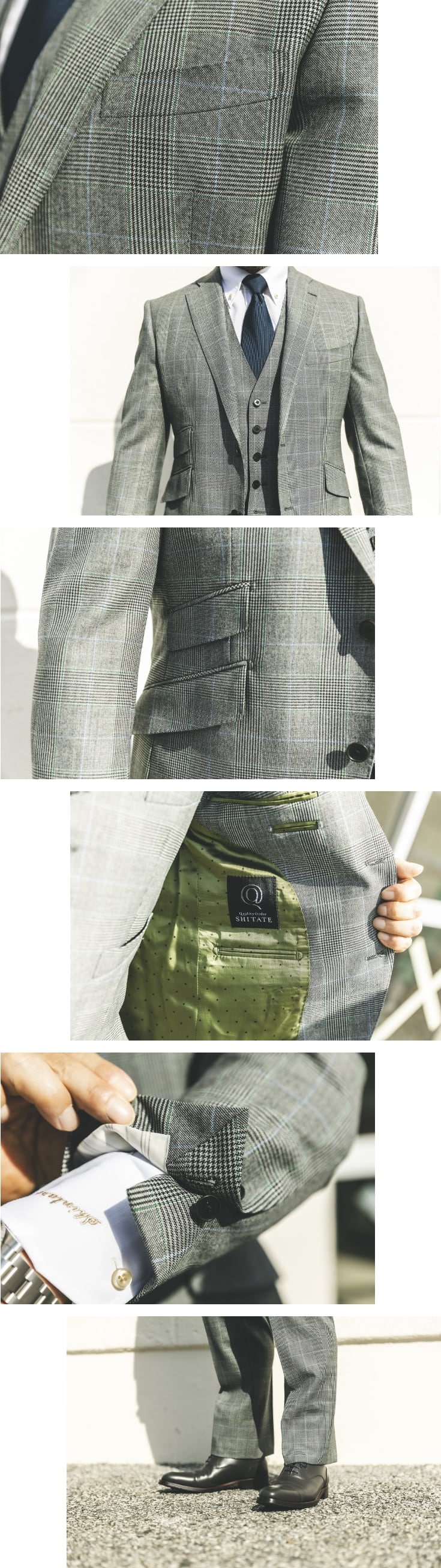 今回、選んだ生地の柄は珍しいです。いろいろとアドバイスをいただきながら作ったので、センスがいいですね。私は寒い時期には、今回のようにスリーピースのスーツを好んで着ます。コートを着ると重くなるじゃないですか。しっかりとした生地でスリーピースを作ってもらえば、コートなしでも暖かいですから。「SHITATE」で作っていただいたスーツは質感もいいですし、何度も使えそうなのでうれしいです。たくさんスーツを持っていても、お気に入りのものばかり着てしまいがちですが、このスーツもそうなってくれそうです。そういえば、既製品のスーツを着ていたころ、胸の厚みと背中の広背筋が発達しているためか、腕が動かしにくいことも。それが今回仕立てていただいたスーツでは一切なく、本当に着心地が良くてうれしいです。