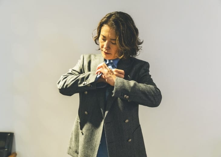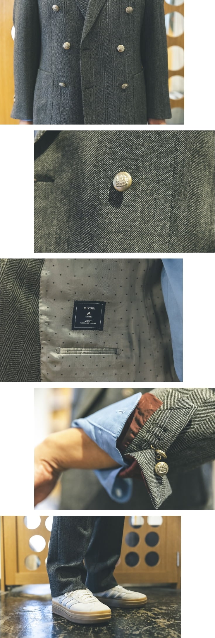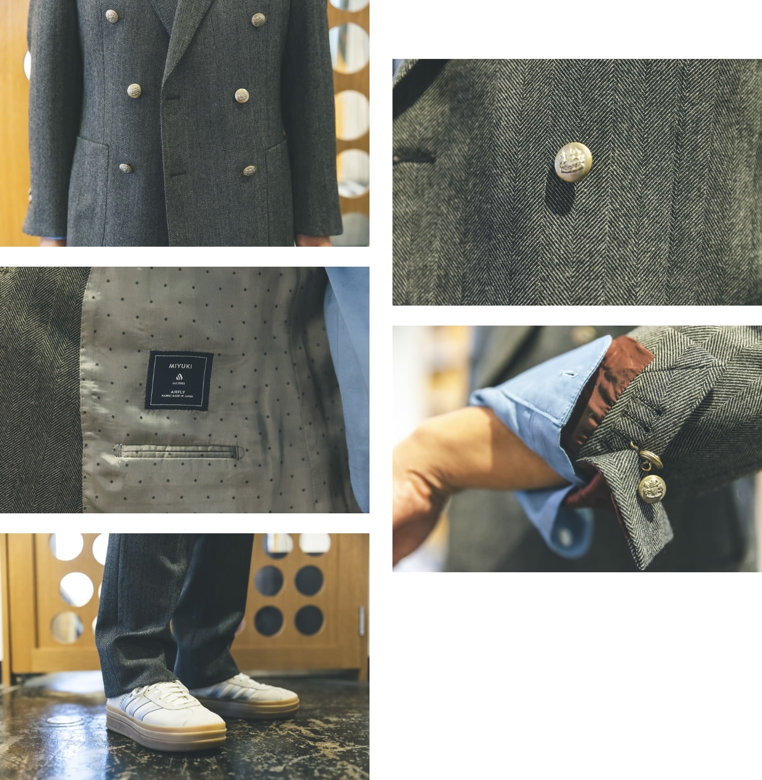 今、ユニセックスのものが増えてきていますが、私自身も今回、メンズスーツで仕立てていただきました。このヘリンボーン柄の生地はあまり手に入らないものなので気に入っています。実はジャケットのボタンは、打ち合わせのときにかなり迷いました。生地がしっかりと主張したものだったので、当初ボタンは水牛の角でできたグレーのものを選んでいました。でも、打ち合わせが終わるギリギリで、「ここまでこだわったのだから、ボタンもシルバーの目立つものでもいいのでは!?」と思い、メタルのシルバーボタンを選びました。完成したスーツを試着してみると、このボタンにして良かったと思いました。