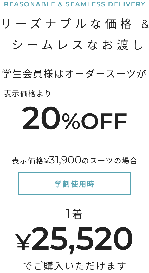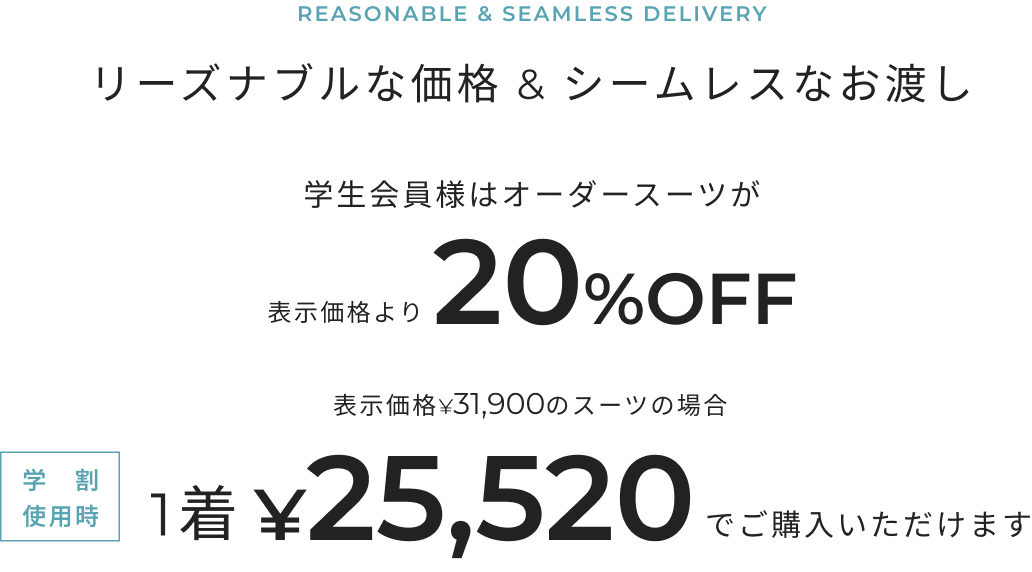 メンズ・レディースともにスーツ1着 税込31,900円からお作り頂けます。ジャケットは税込22,330円、パンツ・スカート・ベスト(メンズのみ)は税込9,570円、メンズシャツ税込6,490円からお作り頂けます。