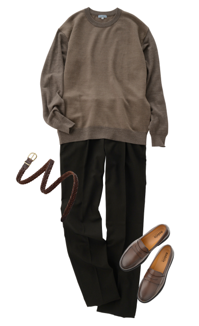 圆领针织衫 (棕色)褶裥休闲裤 (褐色)平底鞋 (深褐色)