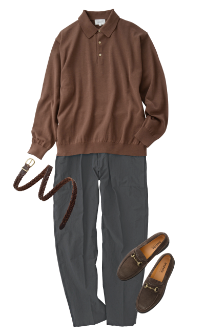 POLO衫 (棕色)褶裥休闲裤 (灰色)比特乐福鞋 (棕色麂皮)