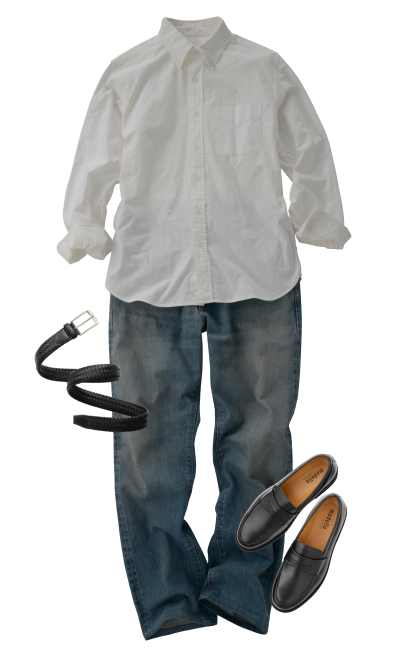 休闲衬衫 (白色)休闲裤 (牛仔布)平底鞋 (黑色)