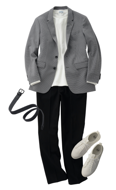 休闲外套 (灰色千鸟)褶裥休闲裤 (黑色)圆领T恤 (白色)运动鞋 (白色)