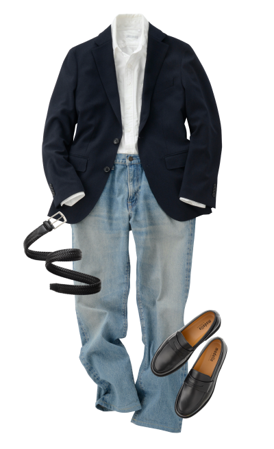 休闲外套 (藏青色)休闲裤 (牛仔布)休闲衬衫 (白色)平底鞋 (黑色)