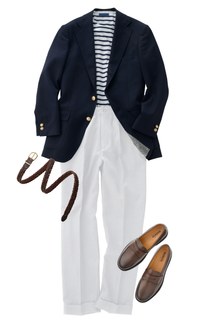 西装外套 (藏青色)褶裥休闲裤 (白色)圆领T恤 (条纹)平底鞋 (深褐色)
