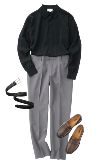 POLO衫 (黑色)西装裤 (灰色)平底鞋 (深褐色)