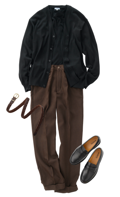 圆领T恤 (黑色)开襟衫 (黑色)西装裤 (棕色)平底鞋 (黑色)