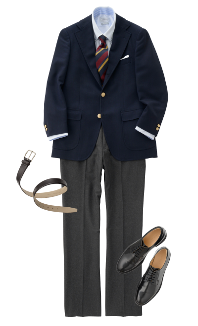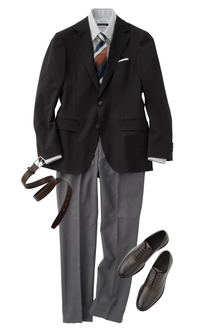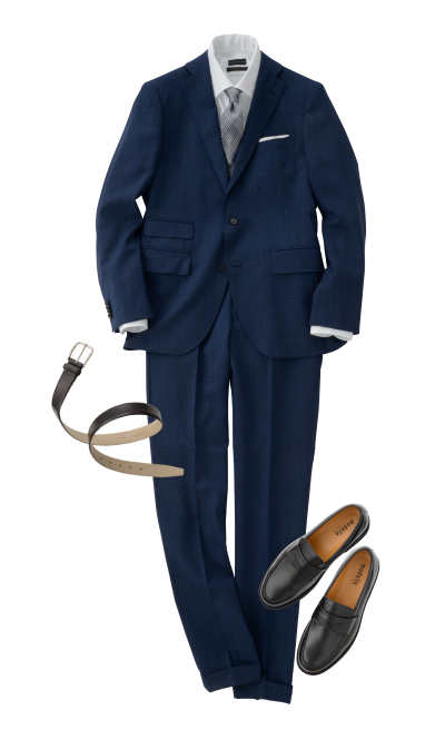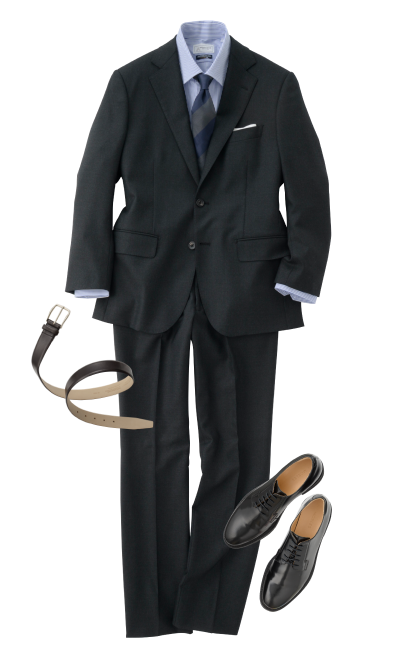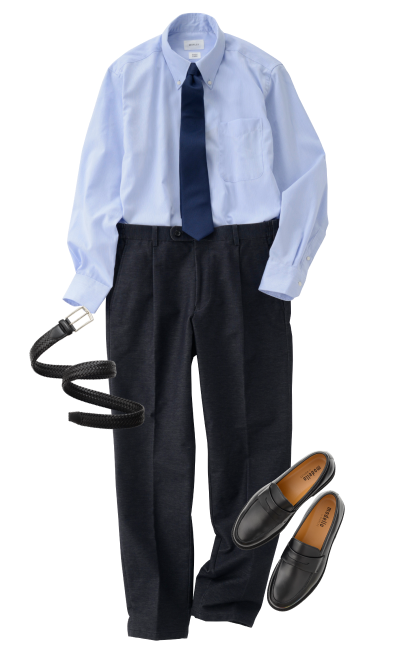 礼服衬衫 (蓝色)西装裤 (炭灰色)领带 (藏青色)平底鞋 (黑色)