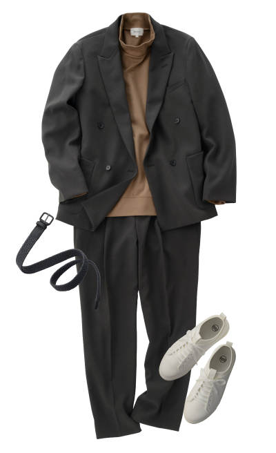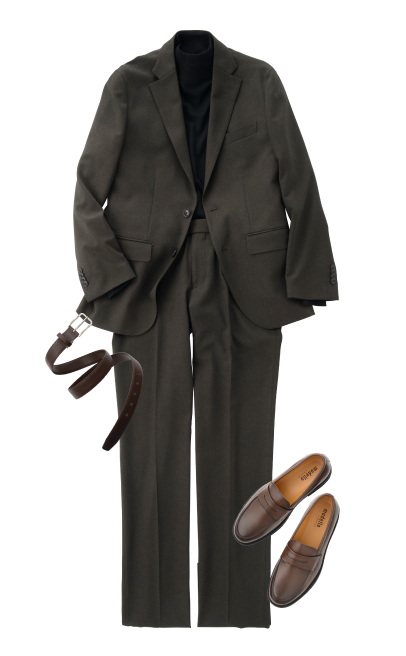 基本色的西装夹克&西装裤搭配礼服衬衫、领带、不系领带时,可以搭配高领针织衫和皮鞋。