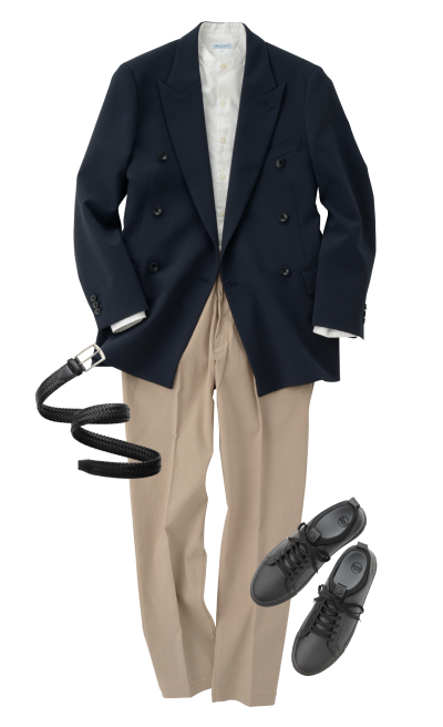 西装外套 (双藏青色)褶裥休闲裤 (米色)带领衬衫 (白色)皮革运动鞋 (黑色)