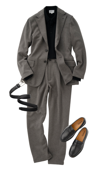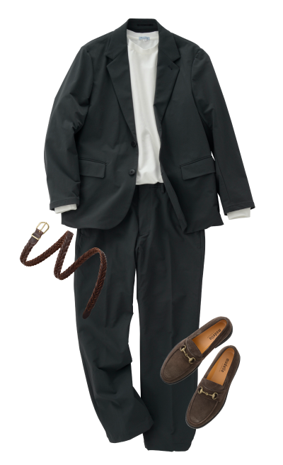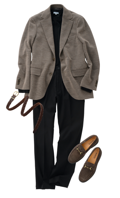 休闲外套 (灰色)西装裤 (黑色)圆领T恤 (黑色)比特乐福鞋 (棕色麂皮)