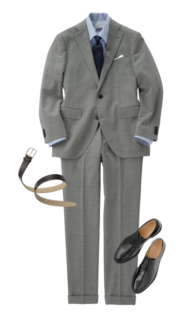 西装外套 (千鸟)礼服衬衫 (蓝色)领带 (小纹)皮鞋 (黑色)