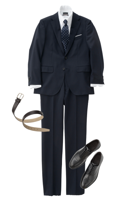 西装外套 (藏青色条纹)礼服衬衫 (白色)领带 (小纹)皮鞋 (黑色)
