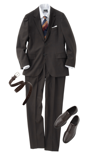 西装套装 (深褐色)礼服衬衫 (白色)领带 (条纹)皮鞋 (深棕色)