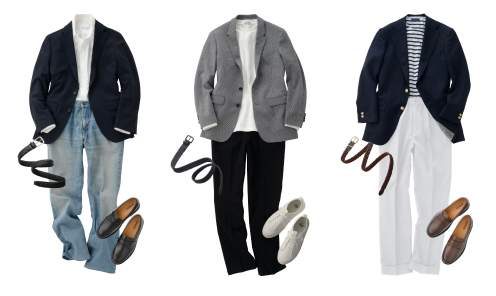 西装外套 (藏青色)褶裥休闲裤 (白色)圆领T恤 (条纹)平底鞋 (深褐色)