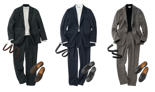 基本色的西装夹克&西装裤搭配礼服衬衫、领带、不系领带时,可以搭配高领针织衫和皮鞋。