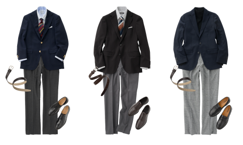 礼服衬衫 (蓝色)西装裤 (炭灰色)领带 (藏青色)平底鞋 (黑色)