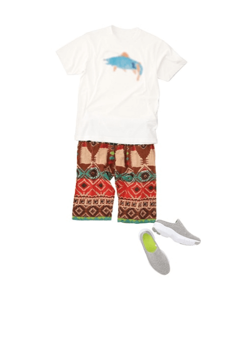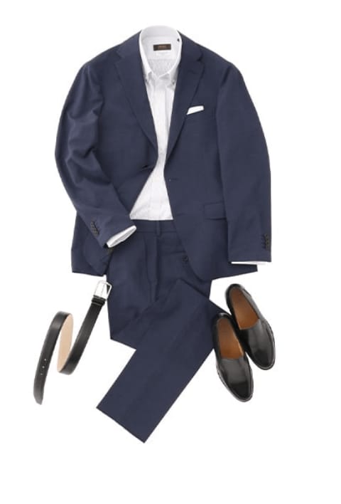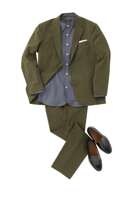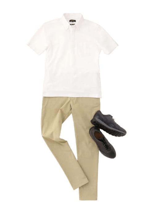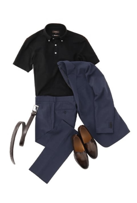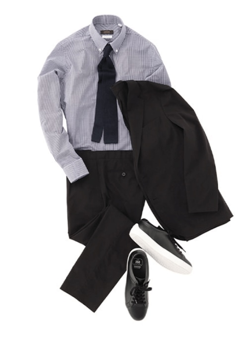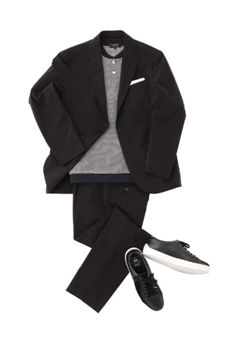 基本是不系领带的套装风格。打底衫是T恤或Polo衫,鞋子是运动鞋等休闲单品的套装搭配。