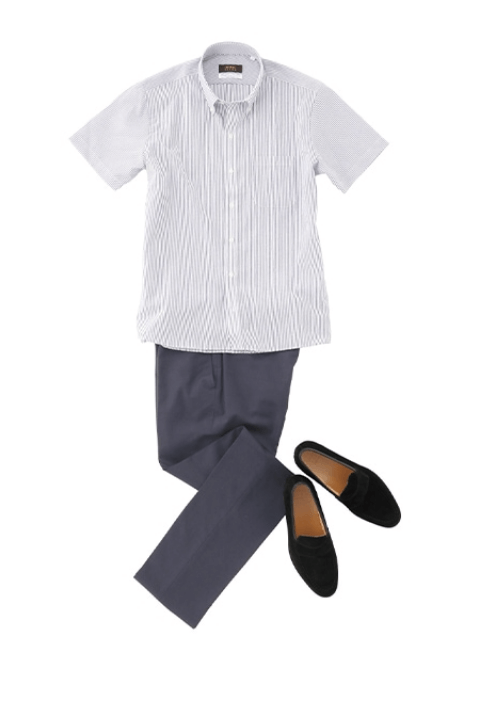 使用了休闲夹克、棉质裤子、休闲衬衫等休闲风格单品的夹克风格。领带、皮鞋是基本款式。裤子基本是中央褶皱裤※中央透明:裤子正面中间的折痕
