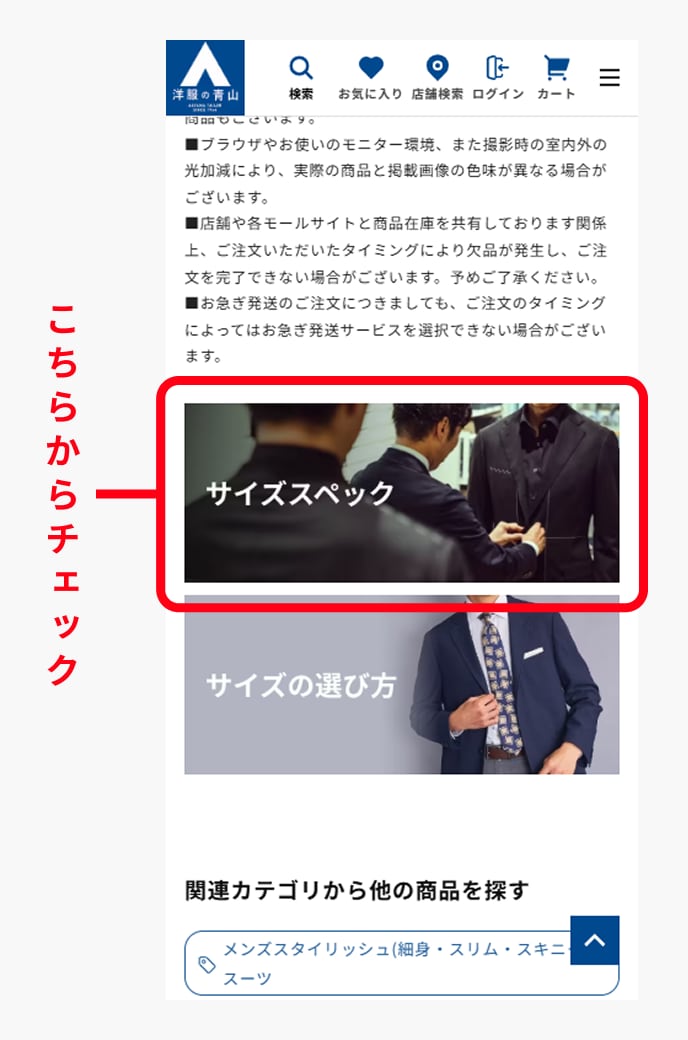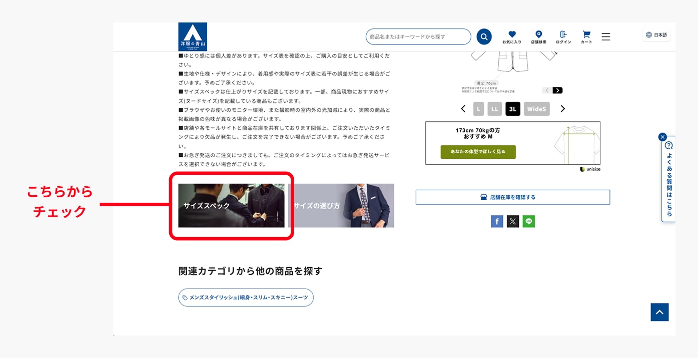 从商品详情页面也可以确认 【推荐尺寸】 【外套成品尺寸】 【西装裤成品尺寸】 的尺寸规格一览表。