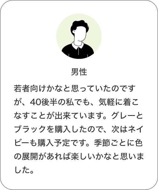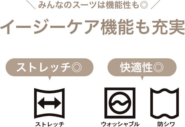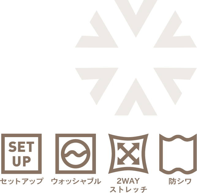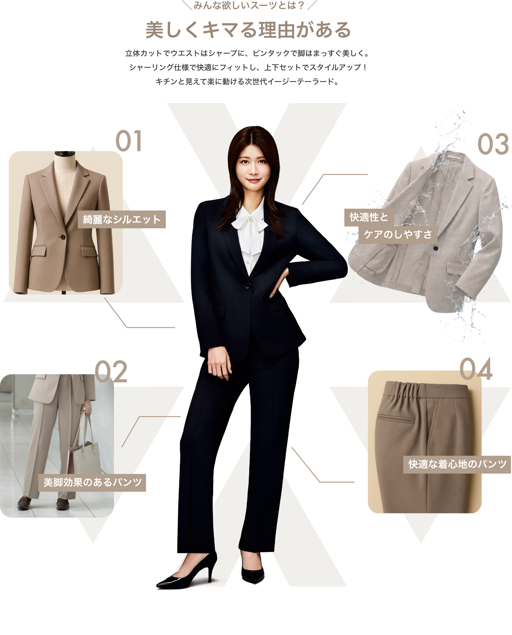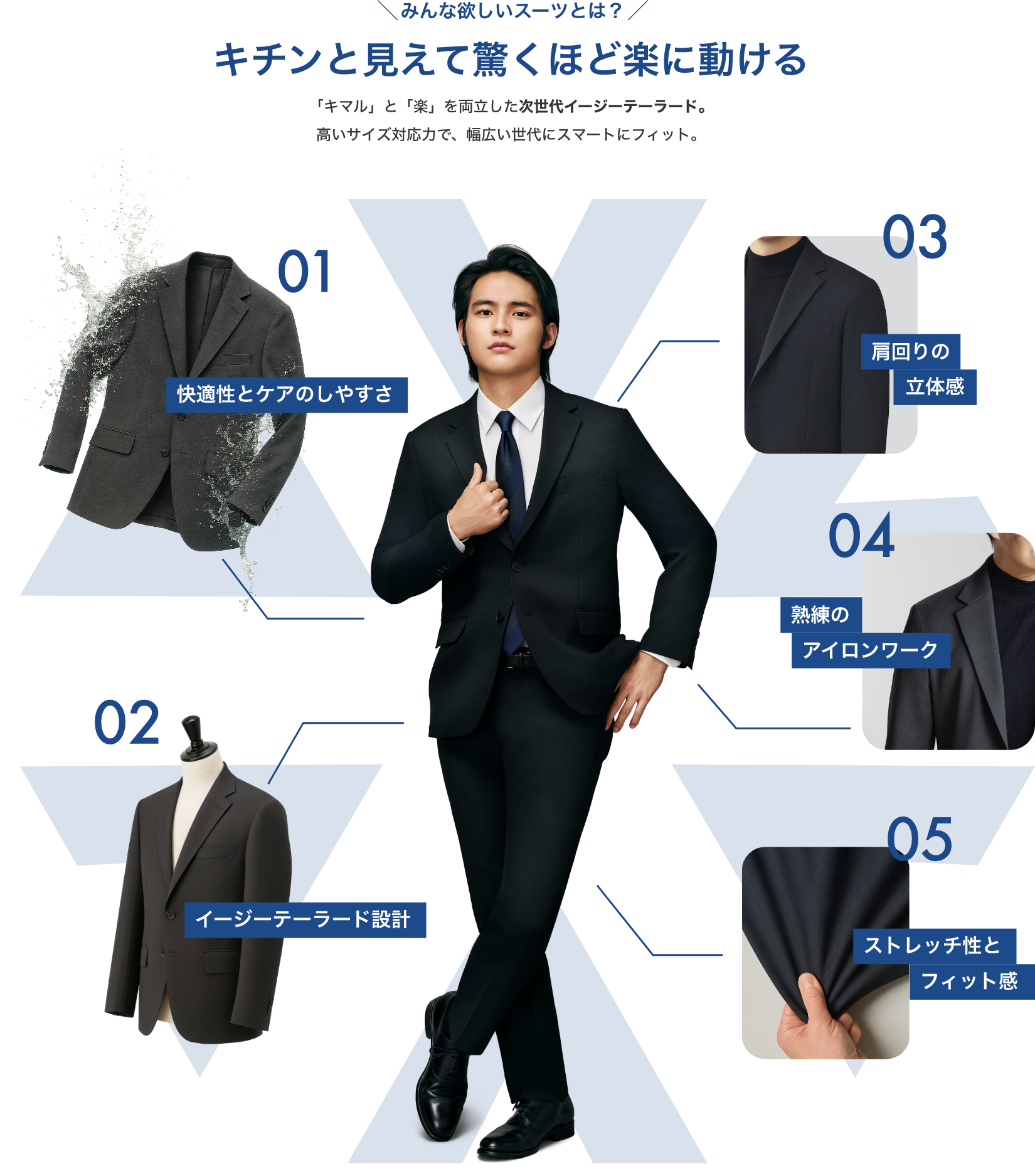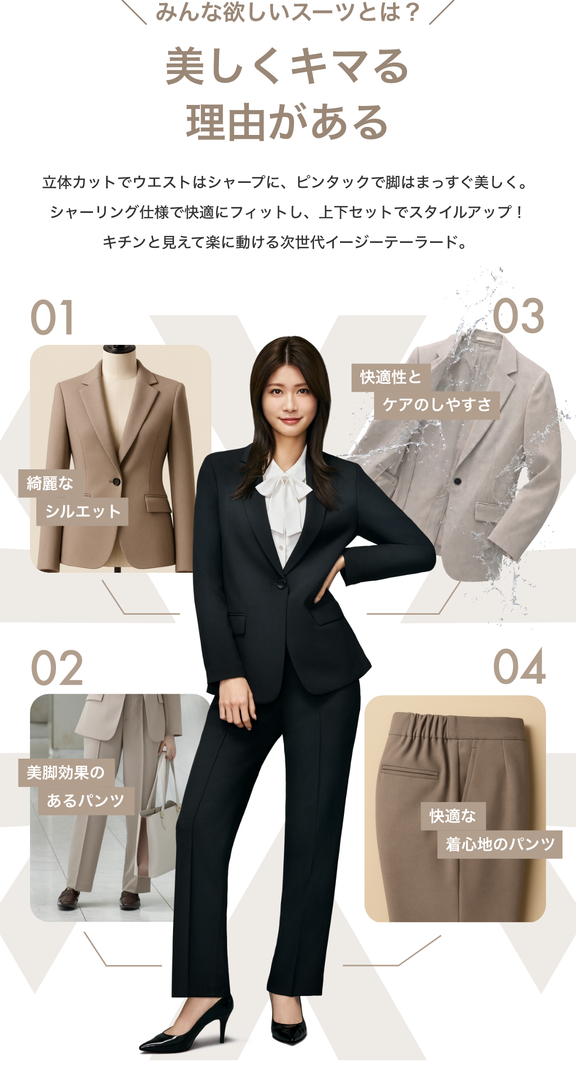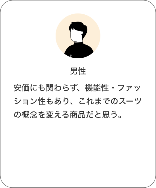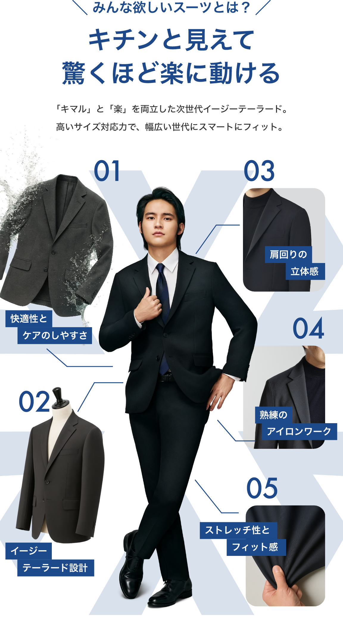 在保持傳統西裝所要求的緊衹感的同時,設計兼具輕盈和柔軟。擁有正式場合也不會走樣的輪廓,在日常生活中也能舒適穿著的舒適感。不論年齡和體型,適合大多數人的新套裝。