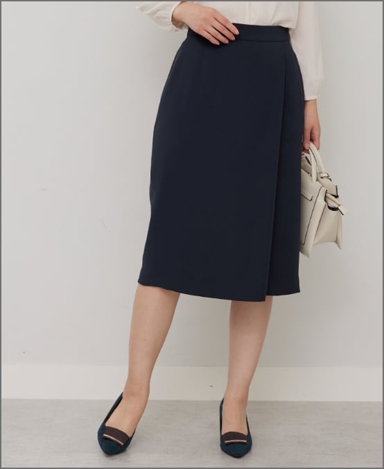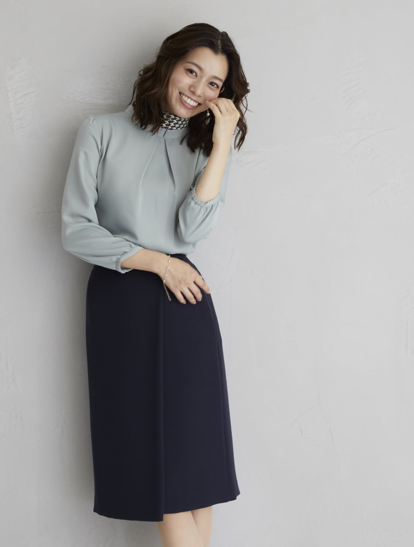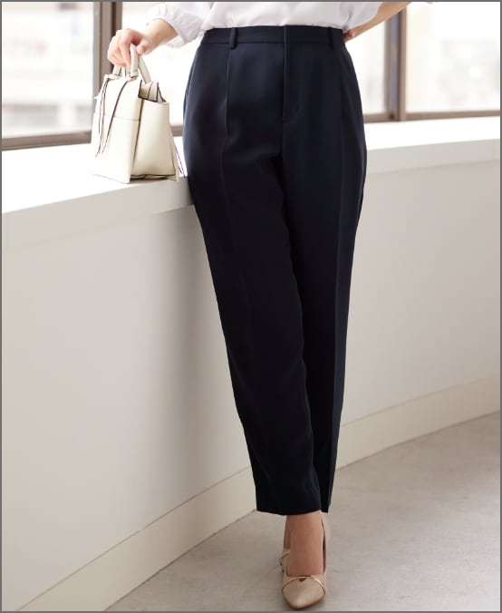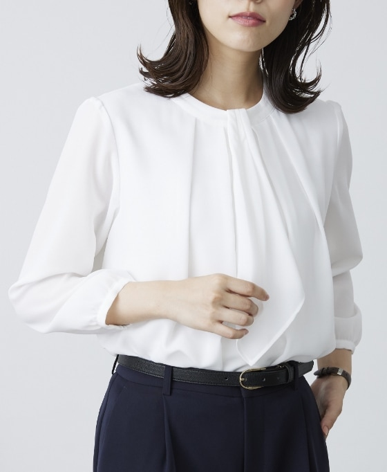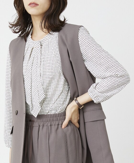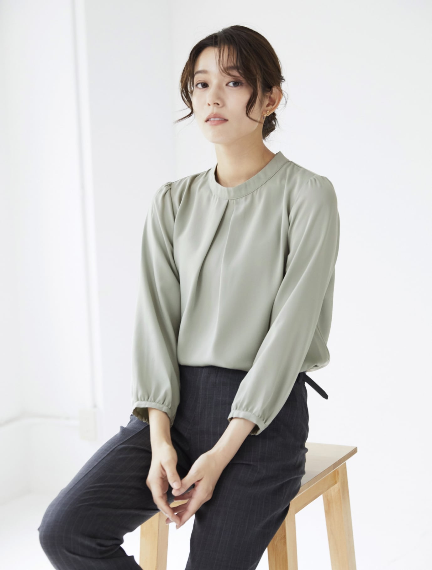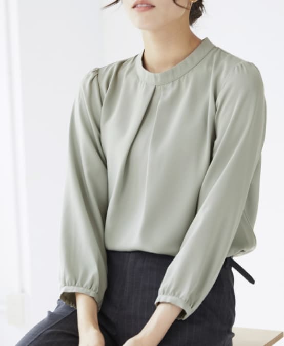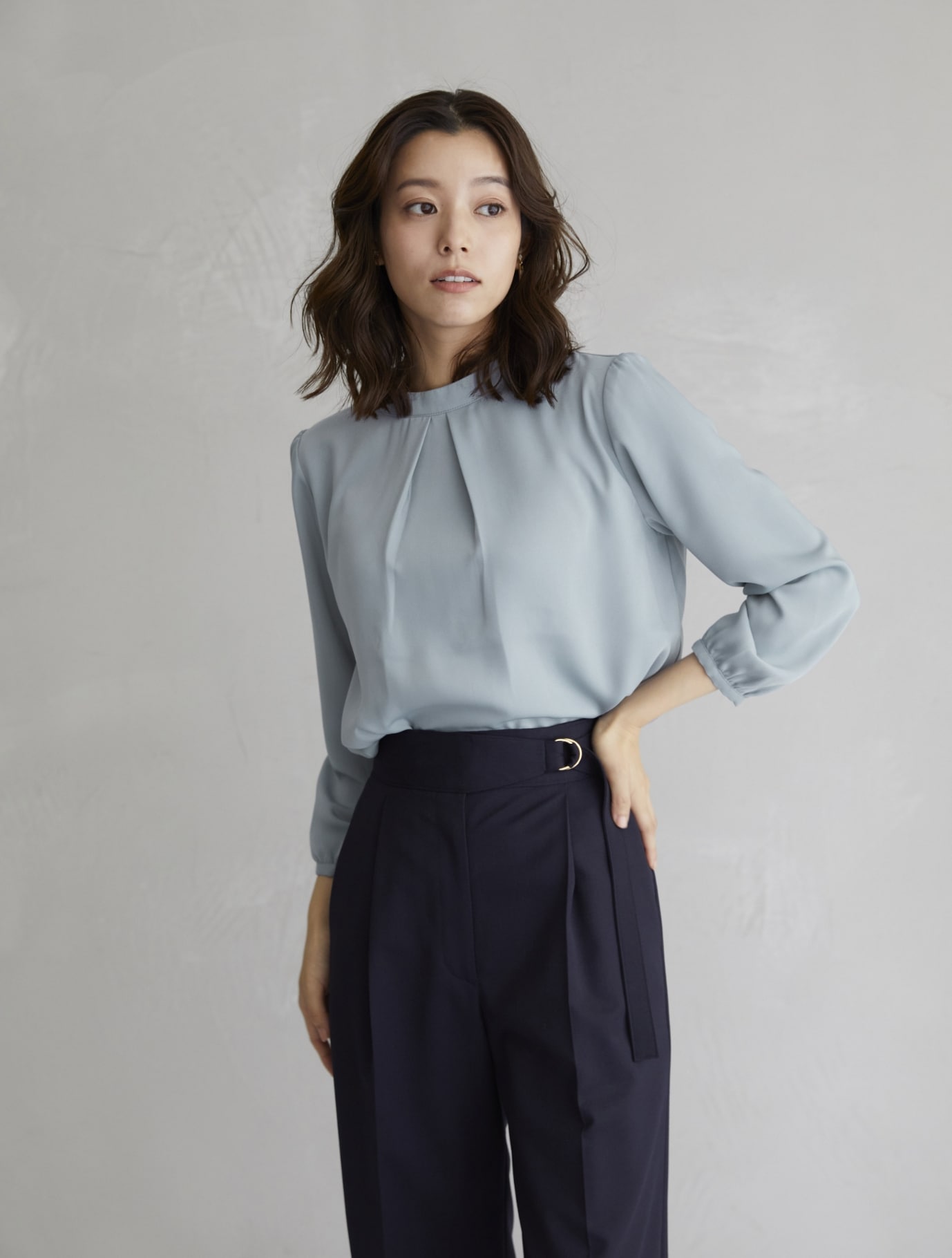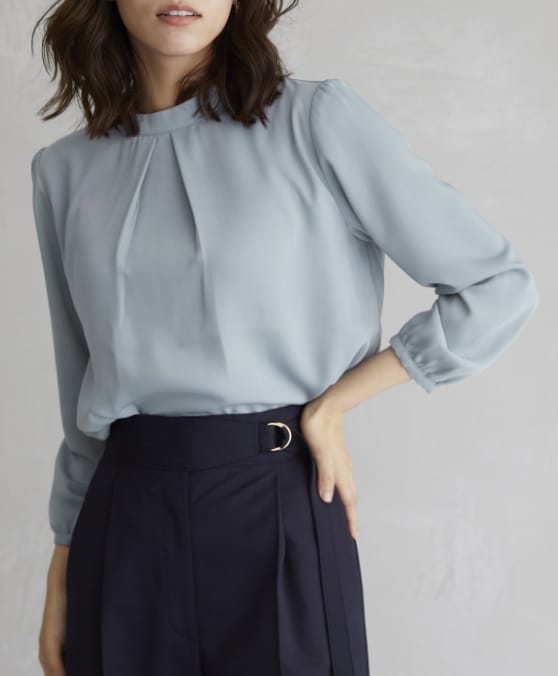 前面的褶皺給人以蓬松柔軟的印象,同時面料下面使用了彈性很高的襯裡,實現了減少透明感和穿著舒適感。