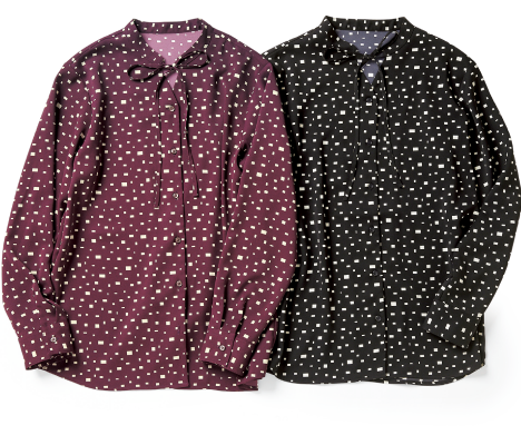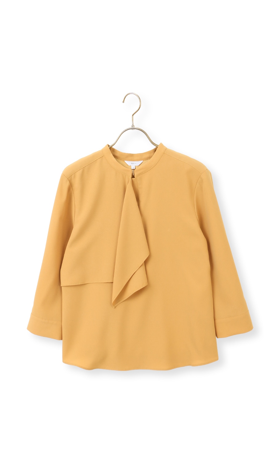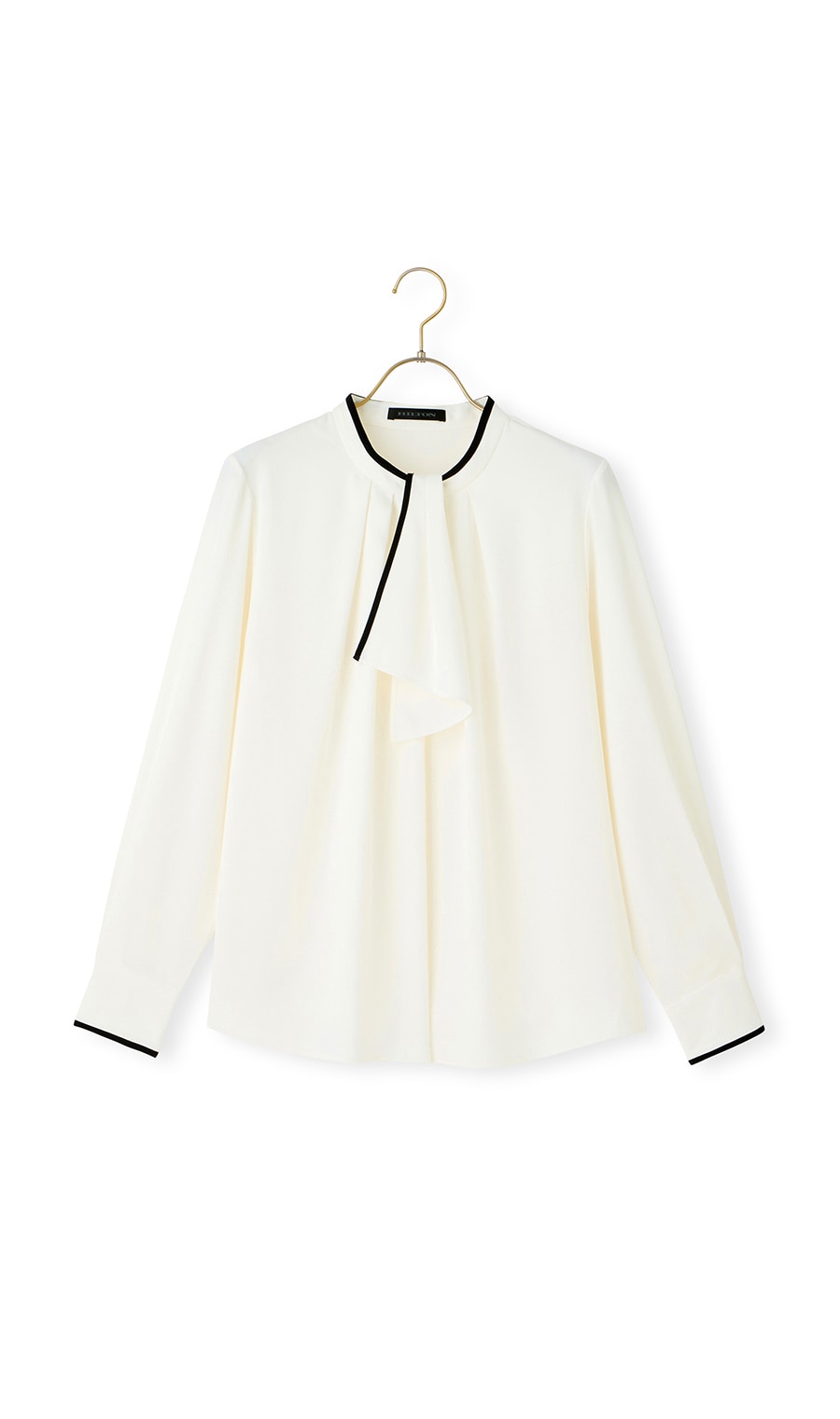 搭配範圍很廣,褶邊領帶可以拆卸的2WAY女式襯衫。衣領、袖口、領口採用了黑色的配色,是整體的亮點。衣領和袖口的同材質包扣也增添了高雅感。2WAY設計讓穿搭更具變化,也是重點所在。