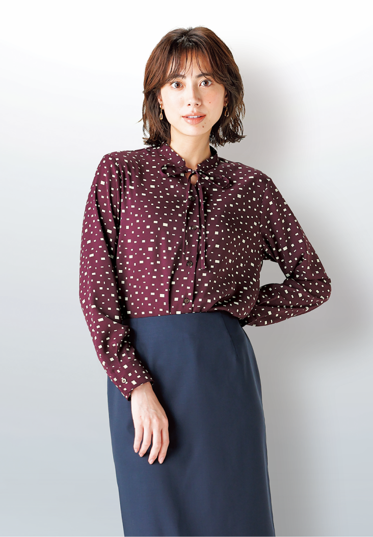 不會顯得過於甜美的細蝴蝶結領帶是這款商品的亮點,可以作為夾克的打底衫穿著,也可以不穿夾克穿著。